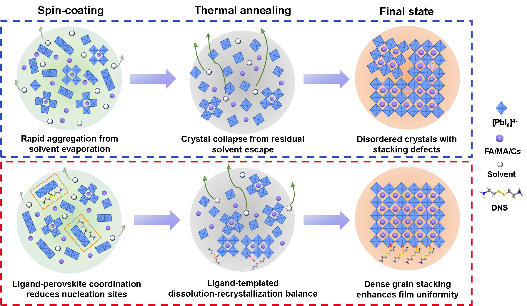 配体辅助配位策略钙钛矿结晶示意图