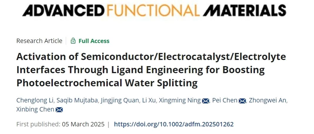 相关研究以Activation of Semiconductor/Electrocatalyst/Electrolyte Interfaces Through Ligand Engineering for Boosting Photoelectrochemical Water Splitting为题,发表在国际知名学术期刊《Advanced Functional Materials》上。