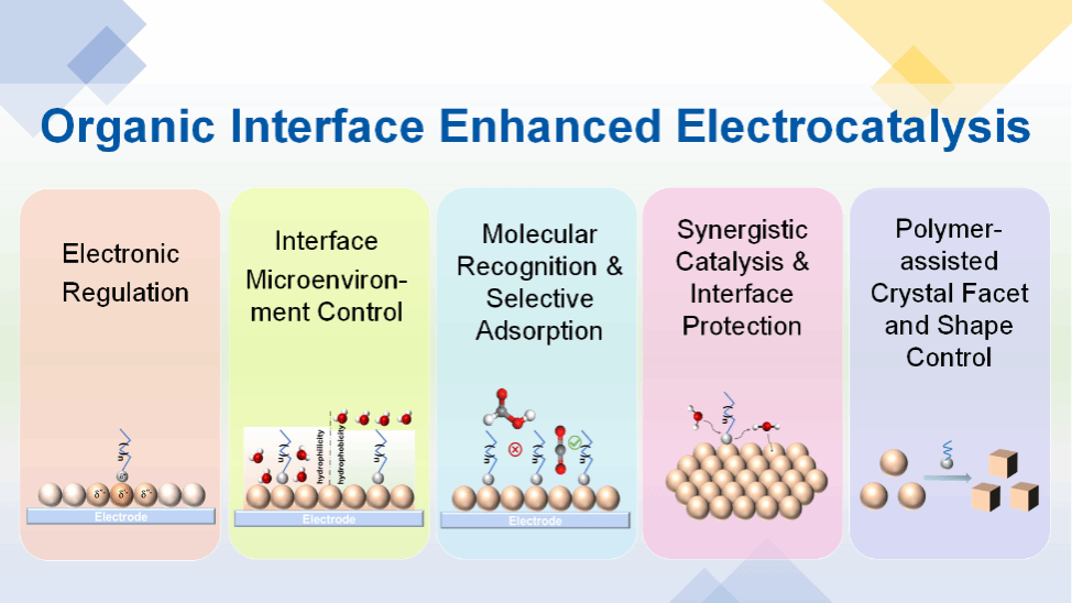 电催化剂的电催化性能与其表/界面性质密切相关,电催化剂表面有机分子化学功能化可以改变电极/电解质界面结构,从而影响电催化性能。文章详细梳理了有机界面在电催化中的设计策略与功能角色;剖析了有机组分与电极材料间的共价键合、配位效应及范德华力等多种相互作用机制;系统总结了有机界面工程在电催化领域的三大技术路线;创新性地提出电子调控、微环境调控、分子识别、协同催化与界面保护五大协同增强机制,为优化催化活性、选择性和运行稳定性提供了新思路。文章最后总结了面向实际能量转换技术应用时所面临的关键挑战与未来展望,可为基于分子层面界面工程的高性能电催化剂理性开发提供概念与方法指导。相关研究成果应用前景广阔,可直接推动绿氢制备、燃料电池、金属-空气电池、CO2电还原制燃料和高附加值化学品等清洁能源技术的发展,对实现碳中和与可持续发展目标具有重要意义。
