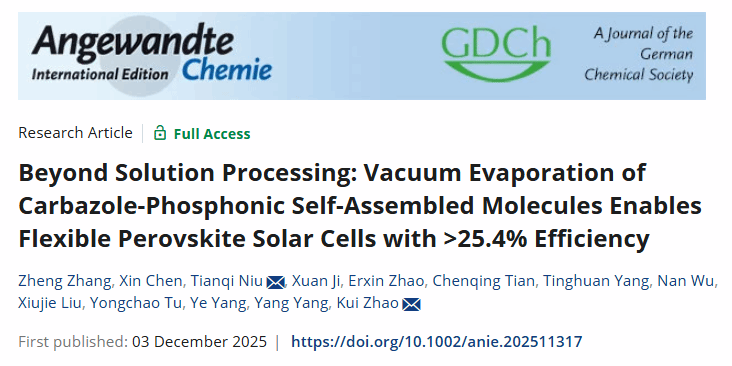对于反式钙钛矿电池,传统溶液法制备的自组装分子(SAM)空穴传输层在柔性衬底上易出现覆盖不均与化学锚定不足的问题,导致界面缺陷增多以及电荷传输受阻,严重限制了柔性器件的效率与稳定性。针对这一关键挑战,公司钙钛矿材料与器件团队创新性地将真空蒸镀技术应用于SAM薄膜沉积,成功制备出高质量的SAM界面层,并系统研究了不同分子构型对柔性界面物性的影响规律。研究发现,干法制备的SAM薄膜具有更高的表面能和更强的化学锚定能力,能够在柔性沉沉地上形成致密、均匀且稳定的覆盖层,有效降低界面接触缺陷,同时确保上层钙钛矿薄膜的高质量沉积,有效提升界面电荷传输效率。基于此,团队制备的小面积柔性钙钛矿太阳能电池实现了25.47%的功率转换效率(认证效率25.38%),大面积器件(1.04 cm2)获得24.08%的高效率。此外,器件在机械弯折测试和长时光照条件下均展现出优异的稳定性,表现出良好的应用前景。该研究成功突破了柔性光伏界面工程长期存在的技术瓶颈,证明了真空蒸镀SAM技术对于发展高效钙钛矿器件的重要价值,并为柔性光伏的规模化制备提供了一条切实可行的路径。相关成果以“Beyond Solution Processing: Vacuum Evaporation of Carbazole-phosphonic Self-assembled Molecules Enables Flexible Perovskite Solar Cells with >25.4% Efficiency”发表于国际著名期刊《Angewandte Chemie International Edition》,公司2023级硕士研究生张征、2024级博士研究生陈鑫为共同第一作者,牛天启博士和赵奎教授为共同通讯作者(论文链接:https://doi.org/10.1002/anie.202511317)。