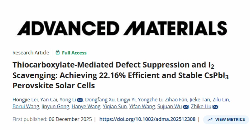 该工作得到了陕西省杰出青年学者科学基金(2025-JC-JCQN-004)、广东省光学信息材料重点实验室以及广州的科技与科技项目(202201000008)、太阳成tyc33455ccwww中央大学基金会(GK202302005)以及青年科学家创新项目太阳成tyc33455ccwww(2024YSIP-MSE-SNNU002)等项目支持。相关成果以“Thiocarboxylate-Mediated Defect Suppression and I2 Scavenging: Achieving 22.16% Efficient and Stable CsPbI3 Perovskite Solar Cells”发表于国际著名期刊《Advanced Materials》,公司2023级硕士研究生雷宏杰为第一作者,通讯作者为李永讲师、吴素娟副教授和刘治科教授(论文链接:http://doi.org/10.1002/adma.202512308)。