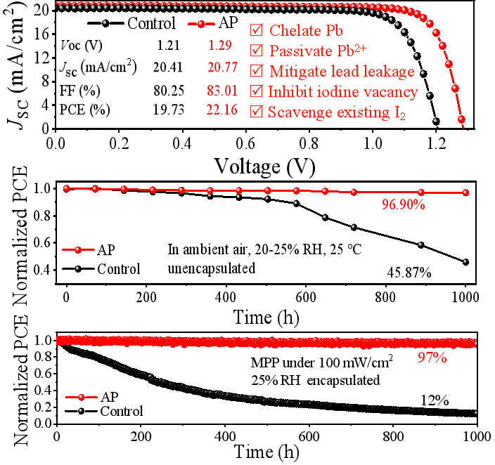 针对上述关键问题,公司刘治科教授团队通过合理的材料分子设计,创新性地引入了吡咯烷二硫代氨基甲酸铵(AP)作为多功能界面修饰剂,在界面上实现了对“缺陷–I2–相变–铅泄露”多重问题的协同调控。本工作创新点主要体现在:首先,利用AP中二硫代氨基(thiocarboxylate)基团的强金属螯合能力,有效固定表面欠配位Pb2⁺,抑制铅相关缺陷并降低Pb2⁺泄露风险;其次,发挥其还原活性,将溶液及薄膜中生成的I2及时消除,阻断I2诱导的相变与界面副反应;最后,依托含氮官能团与I⁻形成氢键作用,从源头抑制I空位形成,并通过诱导二次再结晶显著提升薄膜结晶质量,改善钙钛矿/空穴传输层能级对齐与界面电荷传输。基于这一多功能界面调控策略,团队制备的CsPbI3全无机钙钛矿太阳电池实现了22.16%的光电转换效率,并在长期稳定性测试中表现优异:未封装器件在空气中存储1000小时后仍保持约97%初始效率,封装器件在持续最大功率点光照1000小时后几乎无效率衰减。该研究有效突破了全无机钙钛矿太阳电池在界面缺陷抑制与I2诱导失效方面的长期技术难题,为高效稳定无机钙钛矿电池的制备提供了一条切实可行的新路径。