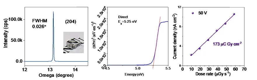 金属基钙钛矿半导体材料在X射线探测方面展示了巨大的前景。但是由于金属具有较大的密度从而有较大的质量,在一些需要便携或者轻质量探测器的场合并不适用,例如X射线防护服上携带的检测装置,智能标签探测装置等。由于有机材料密度与人体当量接近更符合人体特征,且重量很轻,所以用于上述X射线检测是比较合适的。因此,公司和西北工业大学、以色列魏茨曼科学研究院的合作团队制备了一种不含金属的有机钙钛矿作为新型半导体材料并探究其基本光电性质,以适用于X射线探测。突破了以往有机单晶生长困难的问题,生长出了5×5×2 mm3的DABCO-NH4Br3钙钛矿结构的大尺寸单晶,单晶结晶质量较好,具有很低的缺陷态密度(8.1×1010 cm-3)和很小的半高峰宽。这种材料在可见光区没有任何吸收,最大程度的减少了探测过程中可见光对器件的影响;大的电阻导致了器件具有较大的暗电流从而降低了器件的噪声增加了灵敏度,从而得到了清晰的成像结果。作者对这种无金属钙钛矿材料的电荷传输特性进行了探究,想了解是什么导致了价带导带的传输。通过密度泛函理论计算发现导带主要是由有机大分子贡献,价带主要是由卤素贡献。电学测试还展现了长的电荷传输寿命。与传统有机材料相比具有较大的载流子扩散长度(28-55 μm)和迁移率(2 cm2·V-1·s-1),在探测性质上比传统有机材料有更高的灵敏度、更低的启动电压和低的检出限。