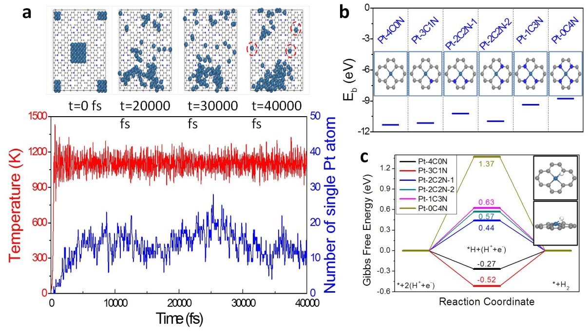 基于此,公司刘生忠教授团队利用理论计算预测了Pt颗粒在高温煅烧过程中的变化情况以及得到的单原子催化剂在分解水产氢中的低过电位。高温煅烧法在制备光催化复合材料中具有以下两个优点。首先,高温处理一方面增强了助催化剂与光催化剂之间的结合,有利于光生载流子在两者之间的界面迁移;其次,高温过程制备的单原子位点更稳定,在光催化反应过程中不会发生单原子位点的破坏。在通过光催化分解水产氢的实验中,制备出来的样品相比于Pt纳米颗粒作为助催化剂来说,其性能得到了很大的提升。该团队在理论指导下合成了一种掺杂SA-Pt的CN(Pt1-CN)和CuS(标记为Pt1-CN@CuS)的复合材料,由于其优良的光催化活性,Pt1-CN@CuS在LED-530光照下有效地裂解水,其AQY为50.3%。电化学测试验证了基于Pt-C4助催化剂的样品具有较低分解水产氢过电位以及载流子界面迁移势垒,DFT进一步得出质子吸附在该单原子位点上快速的电子迁移能力,该工作为制备高效光催化剂体系提供一个新策略。