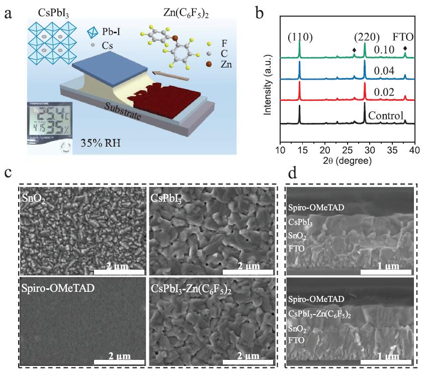 近日,太阳成tyc33455ccwww赵奎教授(刘生忠教授团队)联合阿卜杜拉国王科技大学Thomas D. Anthopoulos教授发现了空气中低温印刷的CsPbI3太阳能电池。通过引入低浓度的多功能分子添加剂Zn(C6F5)2,可以降低快速结晶成膜导致的能级失配和陷阱密度,从而实现高质量的CsPbI3钙钛矿薄膜。结果表明:添加剂倾向于在CsPbI3/SnO2界面附近积累,减少了150 meV的能级差异;同时添加剂在钙钛矿表面上也有强烈的化学吸附,减少了陷阱密度。因此空气中印刷的太阳能电池获得了19%的能量转换效率。