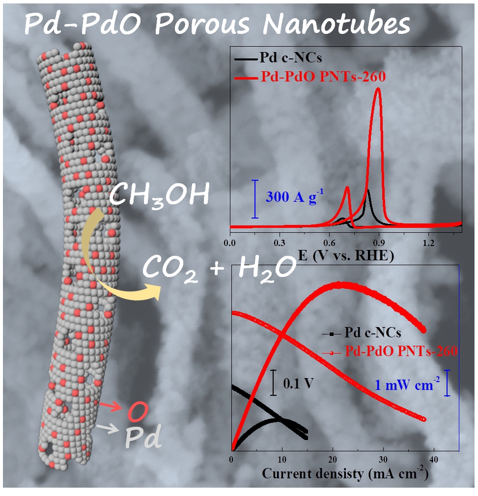 公司陈煜教授团队使用一种简便的自模板法,以Pd(II)-DMG配合物纳米棒为前驱体,合成了异质结构的高质量Pd-PdO PNTs。在合成过程中,Pd(II)-DMG配合物纳米棒的煅烧温度决定了产物的组成。Pd-PdO PNTs具有独特的一维多孔中空结构,具有ECSA大、传质快、自身结构稳定性好等优点,使其在碱性介质中具有较高的电催化活性和稳定性。此外,与Pd PNTs相比,Pd-PdO PNTs表现出更强的MOR活性,表明Pd/PdO界面的存在提高了Pd纳米晶的MOR活性。电化学测试和理论计算结果表明,PdO与Pd的协同作用加速了COads的氧化,从而提高了Pd-PdO PNTs的MOR活性和稳定性。在ADMFCs性能测试中,Pd-PdO PNTs作为阳极电催化剂时功率密度是商业化Pd纳米晶的4.6倍且具有更大的开路电压,这样的结果说明Pd-PdO PNTs在ADMFCs器件中的性能优于商业化Pd纳米晶。