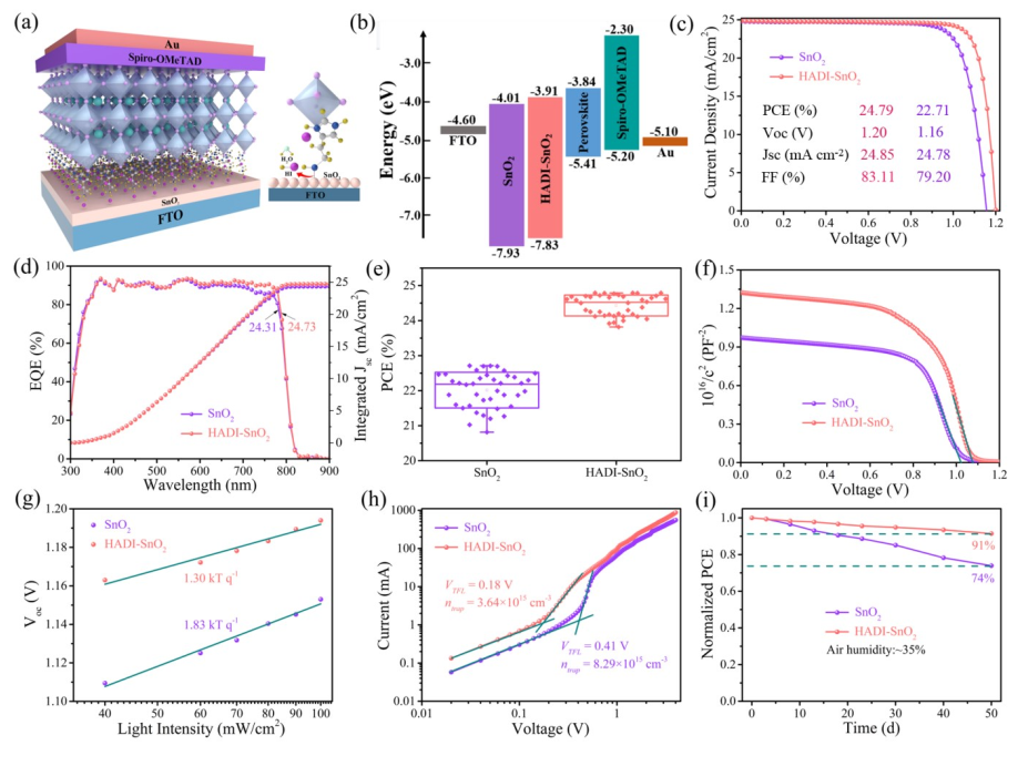 近日,公司刘生忠教授团队基于理论研究设计了一种新型组胺二碘酸盐(HADI)来改性SnO2/钙钛矿界面。实验结果表明,HADI作为一种多功能试剂具有以下作用:(1)调控SnO2能级,改善界面电荷提取;(2)钝化钙钛矿埋底面,减少界面电荷复合;(3)在SnO2和钙钛矿层之间架桥以实现有效的电荷转移。