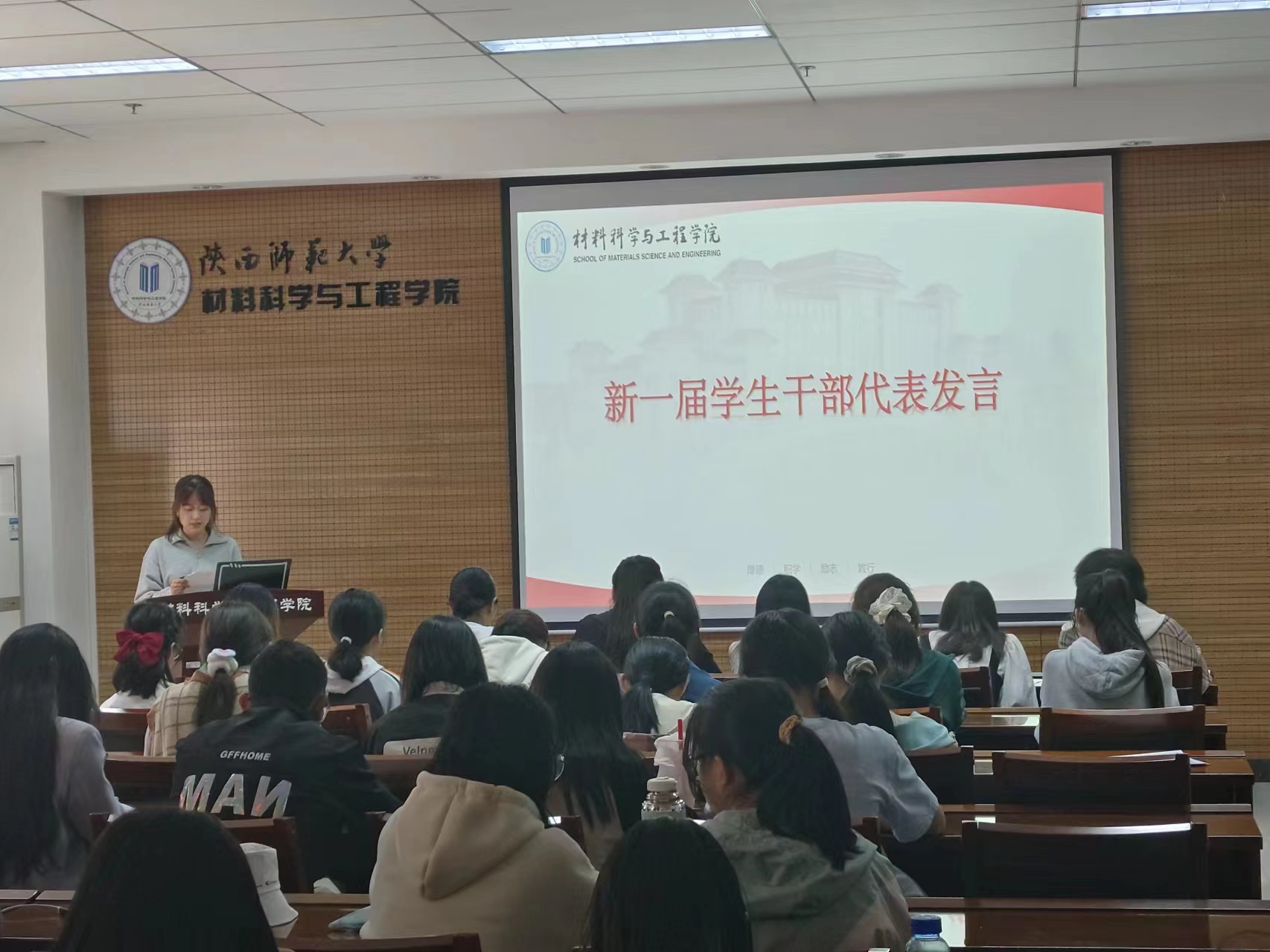 全体新一届员工会干部和团委干部起立宣誓,把对员工干部的要求与全心全意为同学服务的宗旨牢记心间。