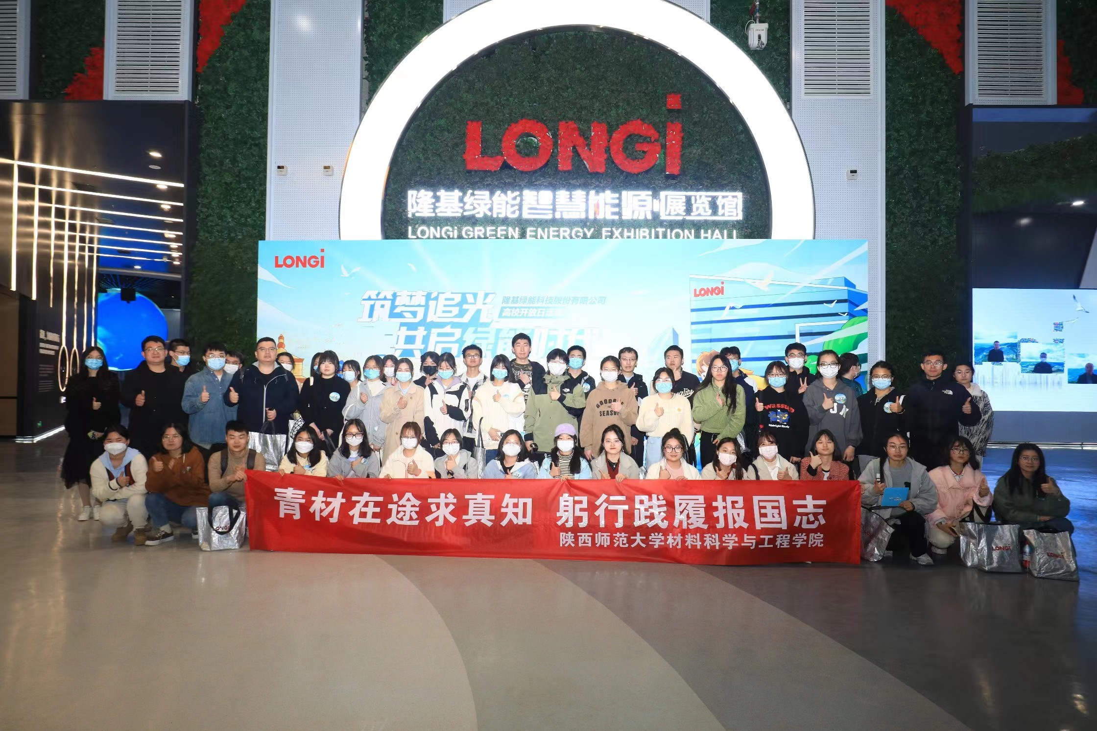 师生一行在工作人员的带领下到隆基绿能智慧能源展览馆参观交流,学习了世界能源发展变迁的过程,深入了解隆基绿能的尖端前沿产品,对光伏产业发展有了直观的认识。