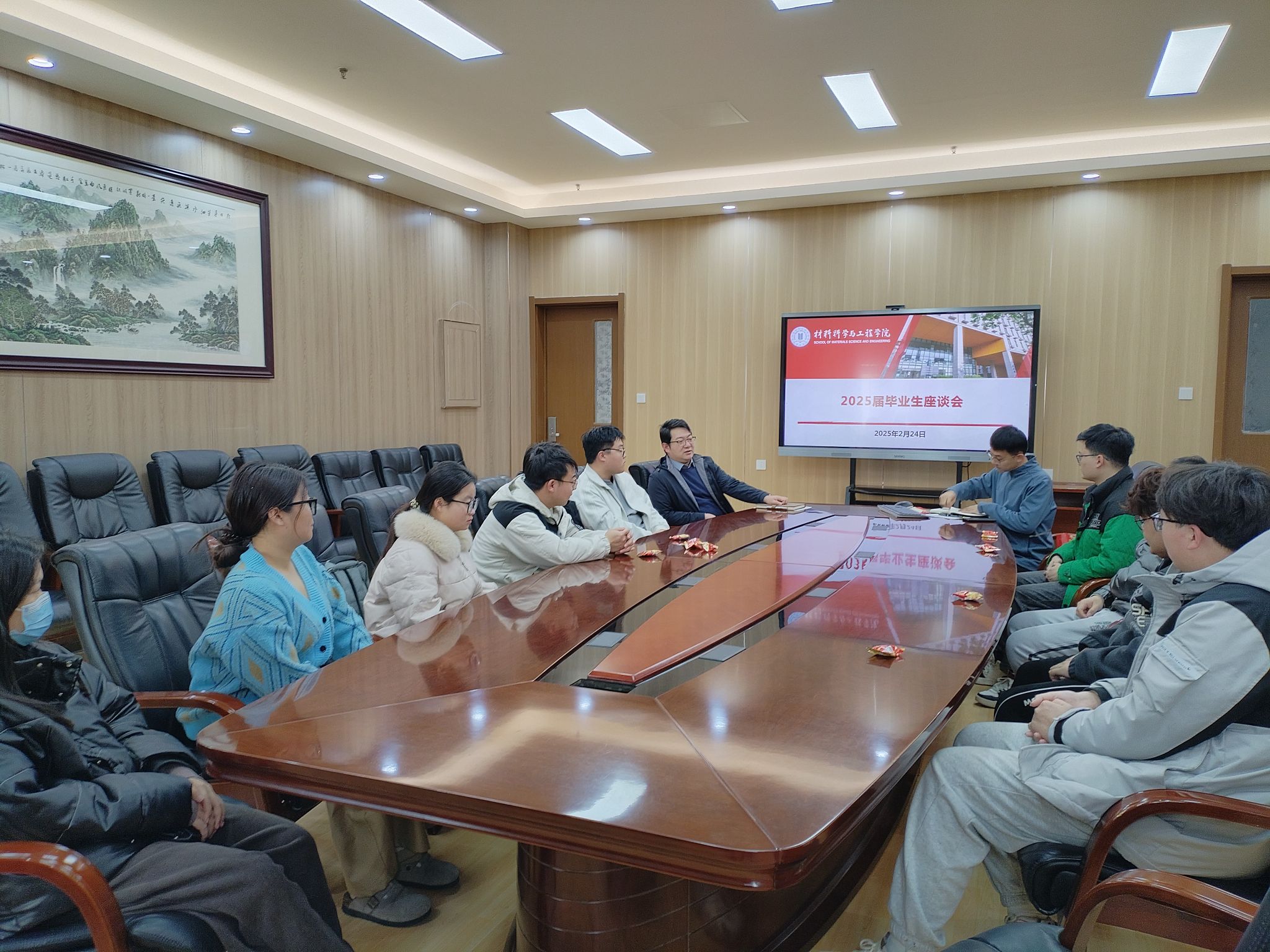 座谈会上,员工们依序发言,分享了各自的想法与困扰,副书记张汉杰与辅导员丁喜当即展开全面且具有针对性的指导。