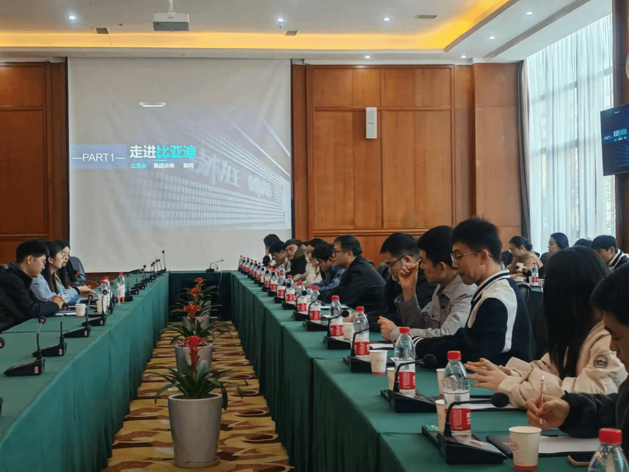 比亚迪工作人员热情接待了来访师生,为大家详细介绍了比亚迪的发展历程。从比亚迪创立之初的艰难起步,到逐步成长为全球新能源汽车领域领军企业的奋进历程,再到“技术为王,创新为本”企业文化内核的深入阐释,以及在新能源汽车技术创新成果方面的全方位展示,讲解生动且细致,让师生们对比亚迪有了更为全面深刻的认知。