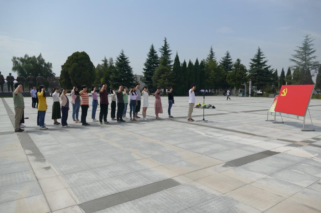 活动中,全体党员在扶眉战役烈士纪念碑前奏唱国歌,向革命先烈默哀鞠躬并敬献花篮,表达了对革命先烈的深切缅怀和崇高敬意。而后全体党员面对党旗,举起右拳,重温了入党誓词。
