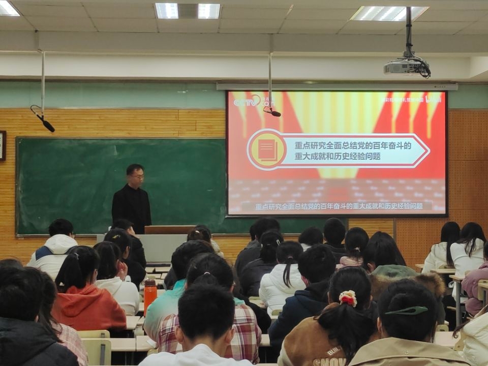 首先,丁喜为全体同学播放了《100秒了解六中全会》宣传视频,让同学们对十九届六中全会有了初步了解。紧接着,他领学了《中共中央关于党的百年奋斗重大成就和历史经验的决议》的部分内容,并结合自身学习工作经历谈了自己的切身体会。最后,同学们集体观看了《我是永远的答卷人》宣传视频。