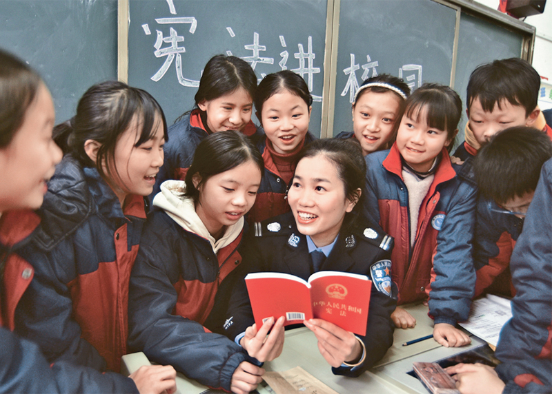 在习近平法治思想指引下,新时代十年我们党全面加强宪法实施和监督,设立了全国人大宪法和法律委员会,建立宪法宣誓制度,设立国家宪法日。图为2022年12月4日,第九个“国家宪法日”活动当天,湖南省郴州市嘉禾县司法局开展“宪法知识进校园”活动,司法工作人员在博雅公司向员工讲解宪法知识。 人民图片供图