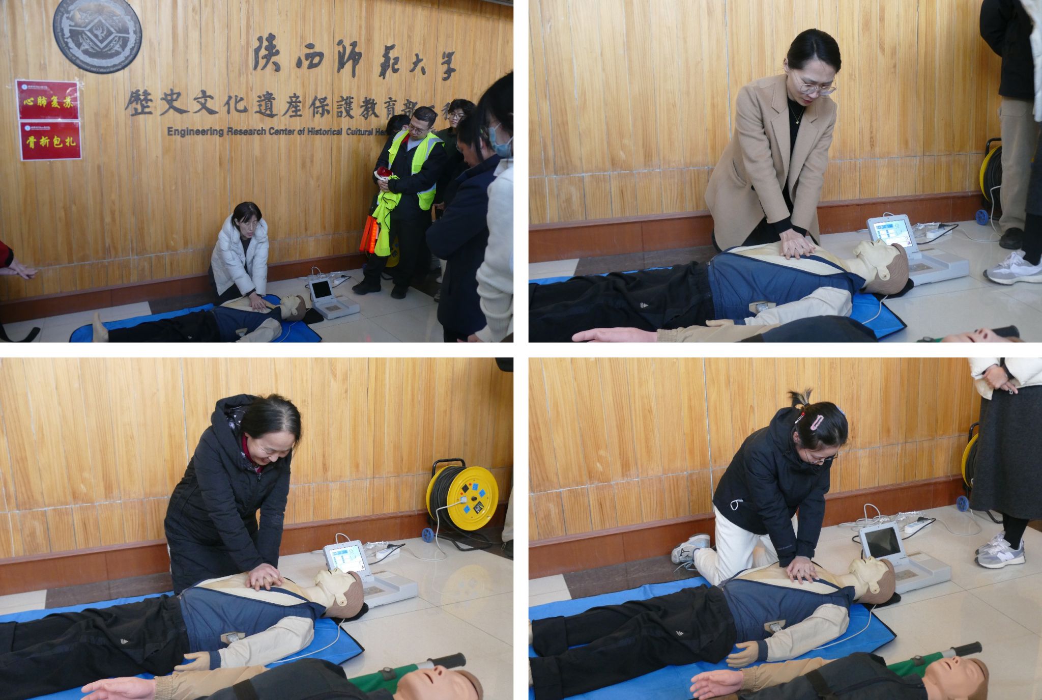 体育公司孙丽君老师现场讲解心肺复苏操作要领,从判断意识、胸外按压到人工呼吸,逐一示范动作规范,并组织师生分组实操练习。
