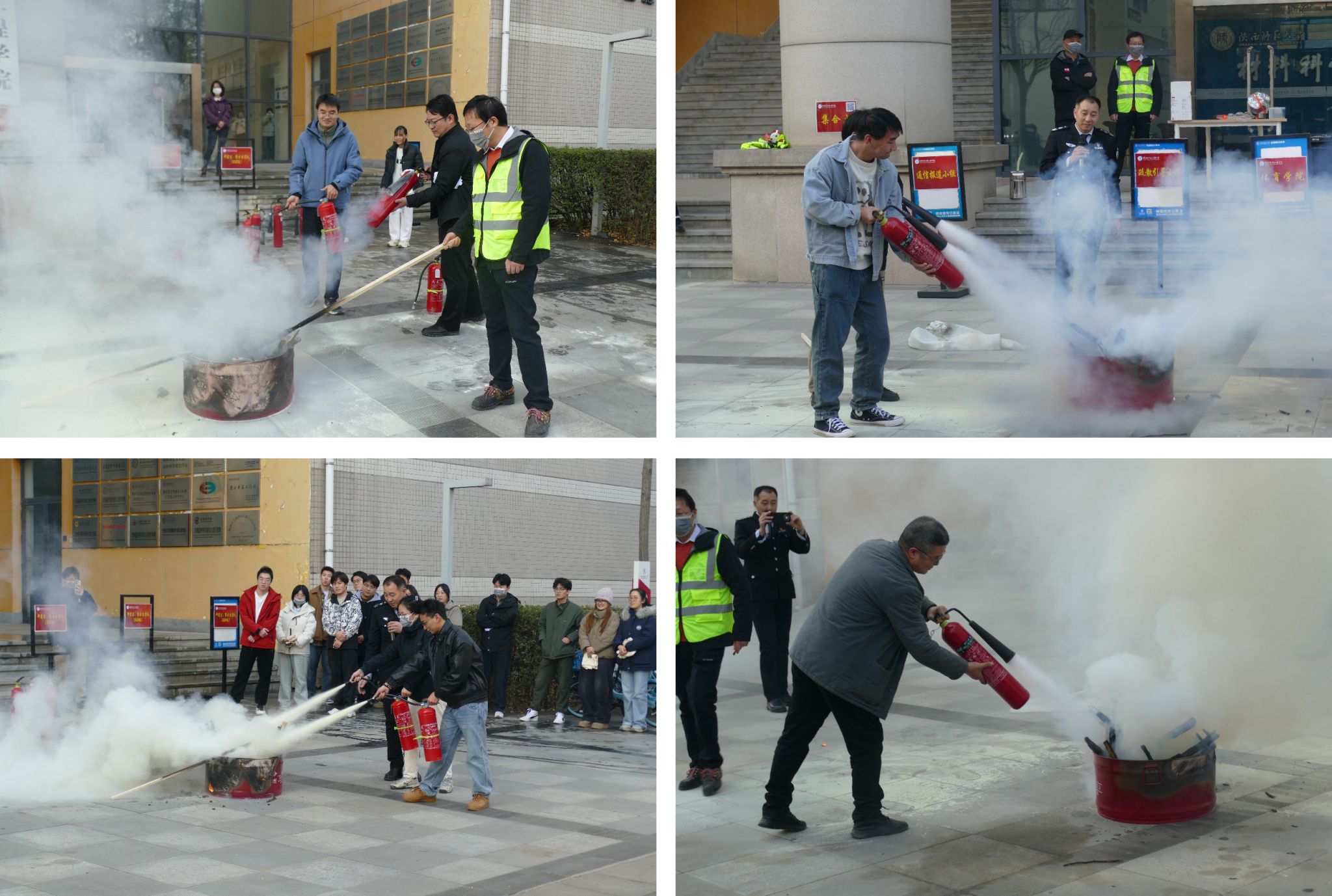 在实操演练区,安全健康教育网陕西站宣教处张辉教官详细讲解了干粉灭火器、二氧化碳灭火器、消防栓、灭火毯的使用方法和注意事项,师生们轮流上场扑灭模拟火点,亲身感受初期火灾处置流程。