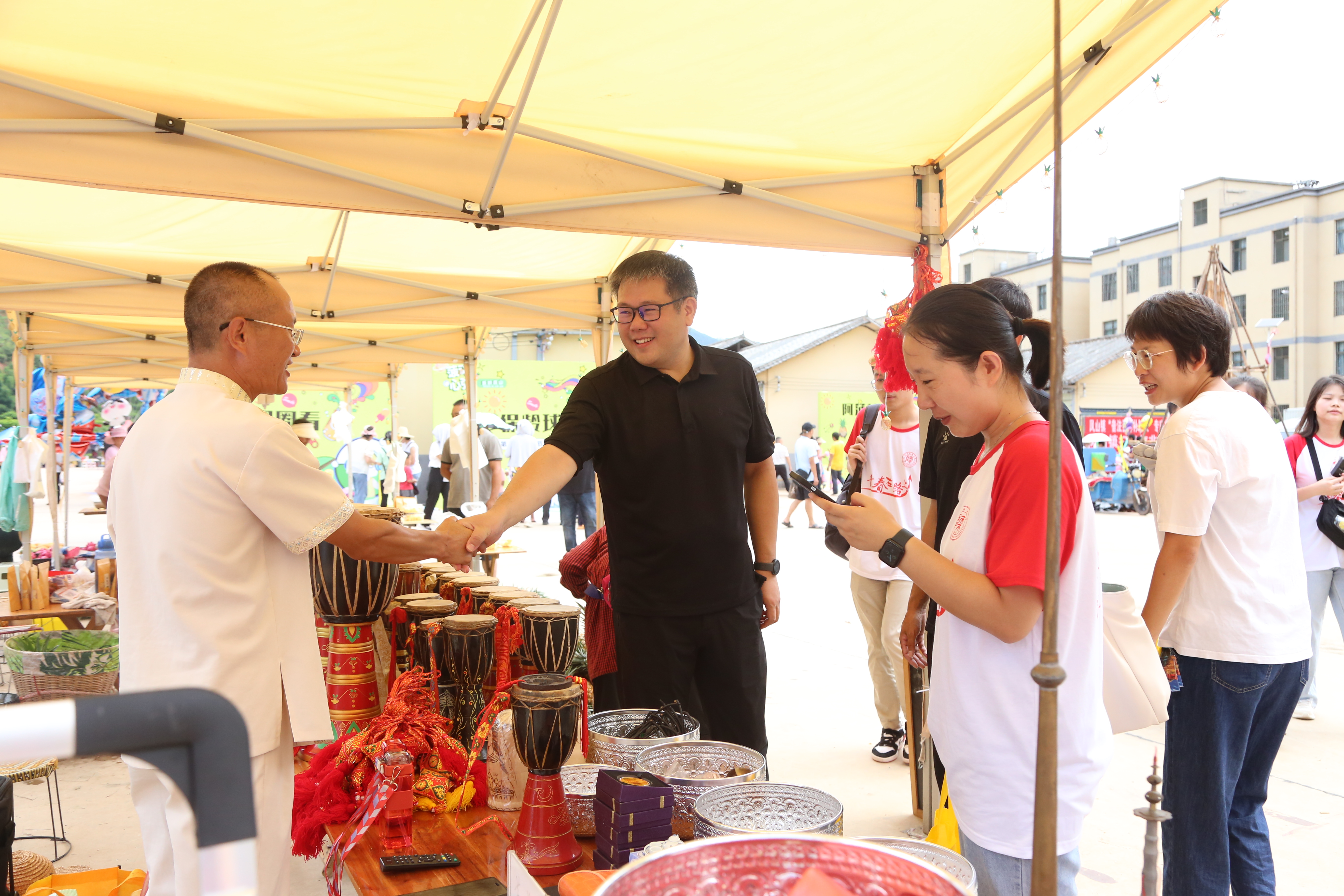 实践团成员赴芒现村传承了三代的市级非遗传承项目“象脚鼓”制作世家了解象脚鼓的文化。